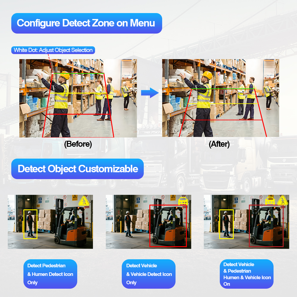 AI బ్లైండ్ స్పాట్ డిటెక్షన్ రియర్ వ్యూ కెమెరా బిల్ట్-ఇన్ కలర్ మార్చే వార్నింగ్ లైట్AI బ్లైండ్ స్పాట్ డిటెక్షన్ కెమెరా సిస్టమ్ బిల్ట్-ఇన్ కలర్ ఛేంజింగ్ వార్నింగ్ లైట్ అనేది AI కాలిబ్రేషన్ సెట్టింగ్కు మద్దతిచ్చే AI BSD కెమెరా మరియు AI మానిటర్ని కలిగి ఉన్న ఒక తెలివైన వాహన భద్రత సెట్, ఇది డిటెక్షన్ ఏరియా సైజ్ సర్దుబాటు, ఆడియో అలారం రకం ఎంచుకోదగినది, పాదచారుల గుర్తింపును ఆన్/ఆఫ్ చేయడం వంటి AI సెట్టింగ్ని మార్చడానికి వినియోగదారుని అనుమతిస్తుంది.