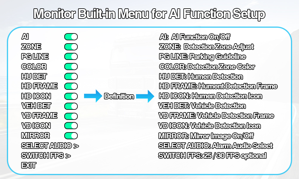 AI వెహికల్ పెడెస్ట్రియన్ డిటెక్షన్ మానిటర్ కెమెరా సిస్టమ్