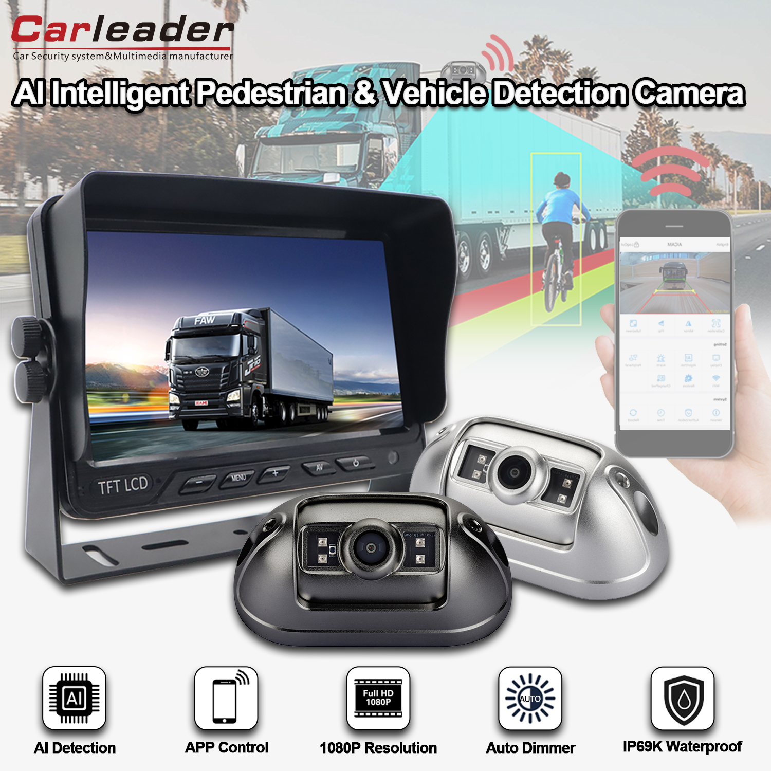 WIFI ద్వారా సెల్ఫోన్తో AI కాలిబ్రేషన్ సెట్టింగ్కు మద్దతు ఇవ్వండికార్లీడర్AI BSD పాదచారులు మరియు వెహికల్ డిటెక్షన్ వెహికల్ కెమెరా సిస్టమ్ అధిక పనితీరు గల 7 అంగుళాల AI BSD సిస్టమ్, ఇది పాదచారులను మరియు వాహనాన్ని గుర్తించడానికి మరియు డ్రైవర్ను అలారం చేయడానికి మద్దతు ఇస్తుంది. USB పోర్ట్ WIFI మాడ్యూల్తో కెమెరా, రిజల్యూషన్ ఎంపికతో సహా, WIFI కనెక్షన్ ద్వారా సెల్ఫోన్తో AI ఫంక్షన్ క్రమాంకనం మరియు కెమెరా ప్రాథమిక సెట్టింగ్ని సర్దుబాటు చేయడానికి వినియోగదారుని అనుమతిస్తుంది,డిటెక్షన్ ఏరియా కాలిబ్రేషన్, అలారం ఆడియో రకం మరియు వాల్యూమ్, డిటెక్షన్ ట్రిగ్గర్ సెన్సిటివిటీ, డిటెక్షన్ ఆబ్జెక్ట్ ఆప్షన్ మొదలైనవి. సర్దుబాటు ద్వారా వారి వాహనాన్ని మెరుగ్గా అమర్చడంలో వినియోగదారుకు సహాయపడండి.