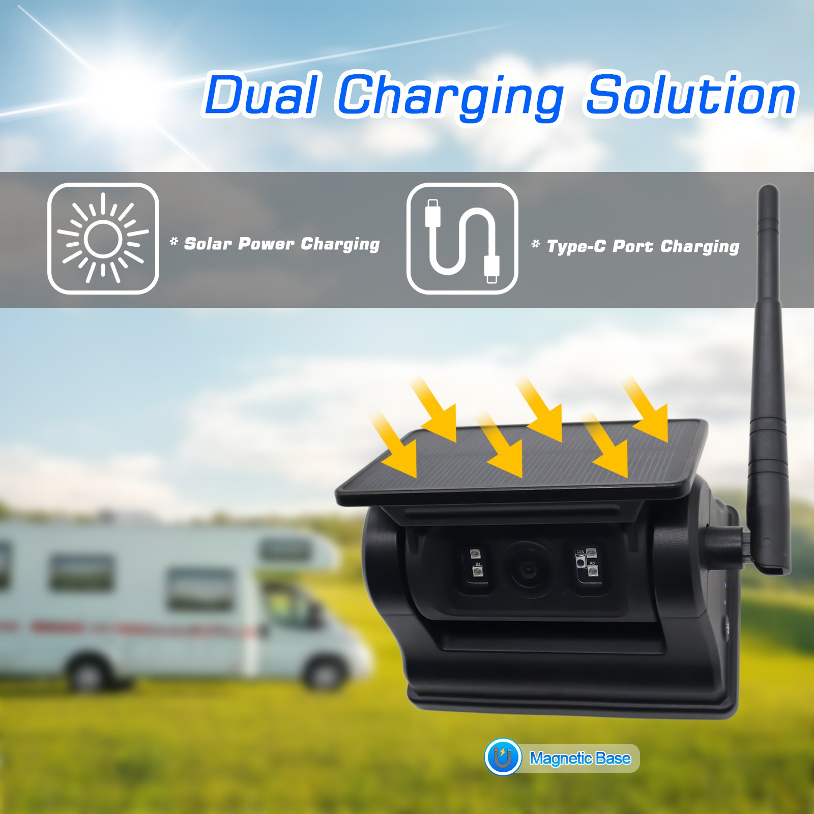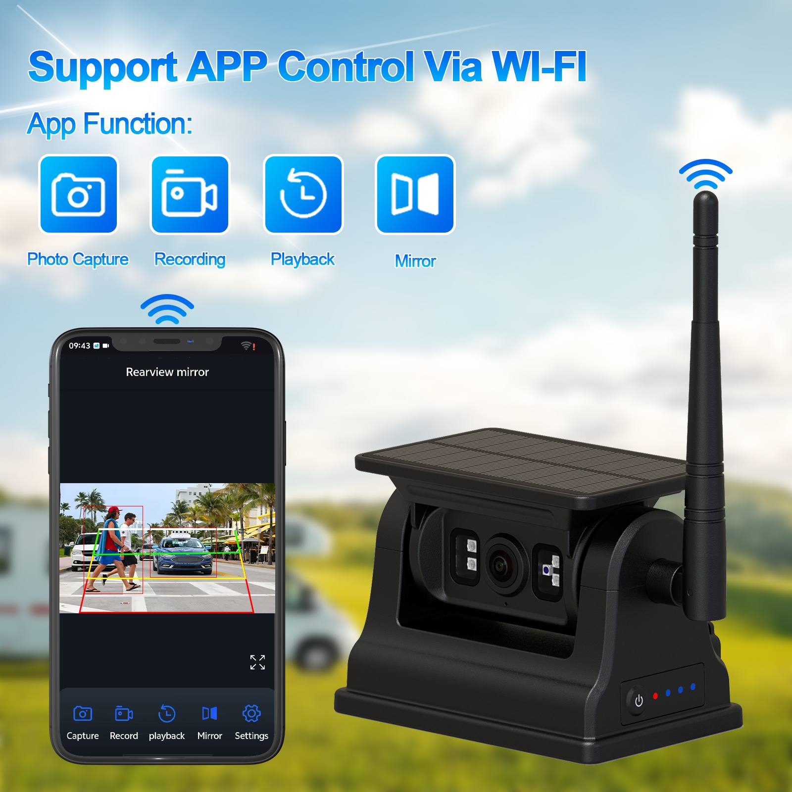 కార్లీడర్తో మీ వాహనం యొక్క భద్రతా వ్యవస్థను అప్గ్రేడ్ చేయండిIOS Android కోసం 1080P మాగ్నెటిక్ సోలార్ WiFi వైర్లెస్ RV బ్యాకప్ కెమెరా- ఇక్కడ ఆవిష్కరణ విశ్వసనీయతకు అనుగుణంగా ఉంటుంది.