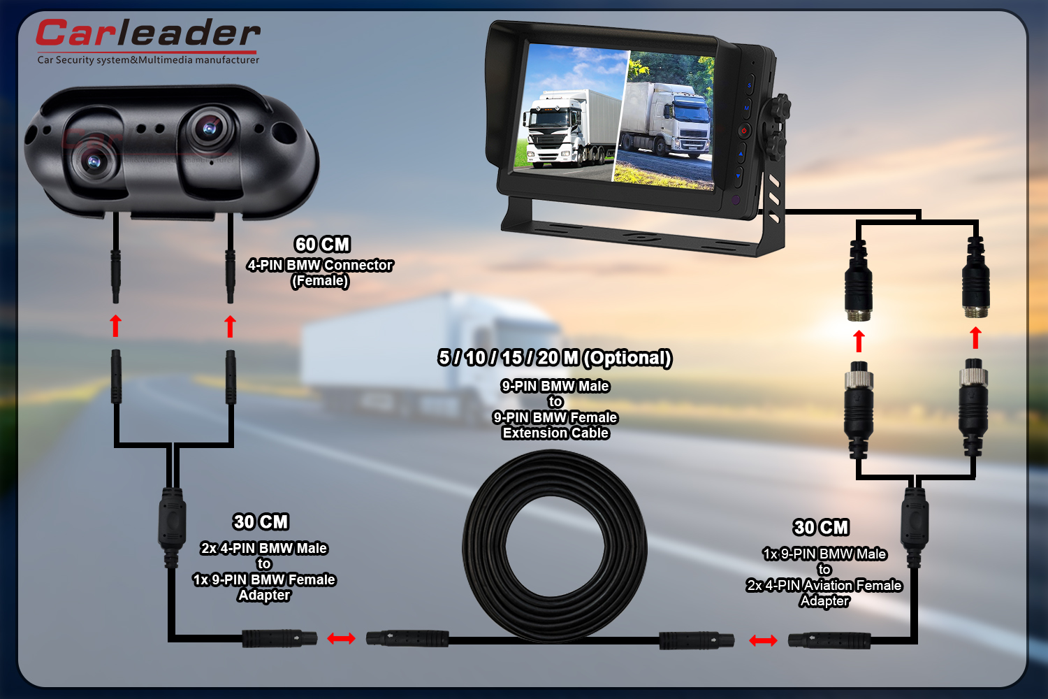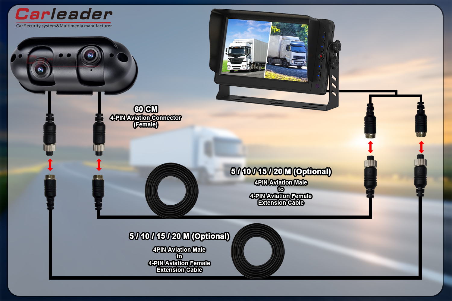 వివిధ వైరింగ్ అవసరాలకు సరిపోయేలా స్టార్లైట్ AHD డ్యూయల్ లెన్స్ హెవీ డ్యూటీ రివర్సింగ్ కెమెరా కోసం కార్లీడర్ రెండు వేర్వేరు వైరింగ్ సొల్యూషన్ను అందిస్తుంది: