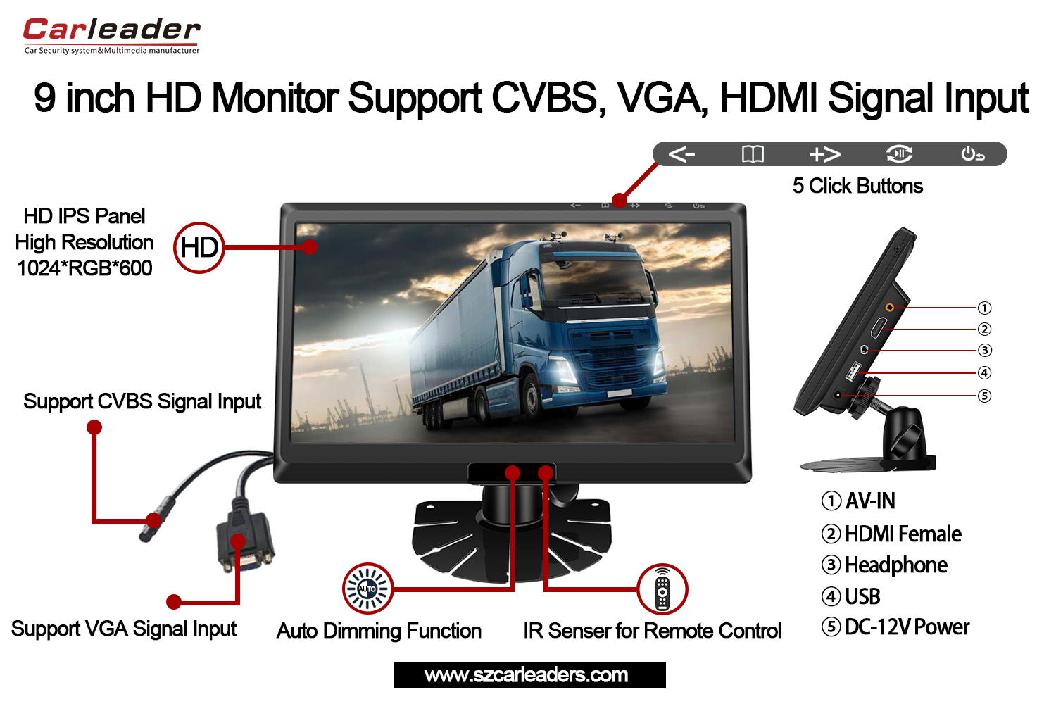 కార్లీడర్9 అంగుళాల IPS స్క్రీన్ HD మానిటర్ మద్దతు CVBS+HD+VGA ఇన్పుట్లువాహన పర్యవేక్షణ మరియు MDVR ఫ్లీట్ మేనేజ్మెంట్ కోసం రూపొందించబడిన అధిక పనితీరు HD మానిటర్. కార్ మానిటర్ CVBS,HD మరియు VGA సిగ్నల్ ఇన్పుట్లకు మద్దతు ఇస్తుంది. మరియు MDVR VGA లేదా HD ఇంటర్ఫేస్ని కలిగి ఉంటే, 9 అంగుళాల IPS స్క్రీన్ కార్ మానిటర్తో ఉపయోగించవచ్చు.