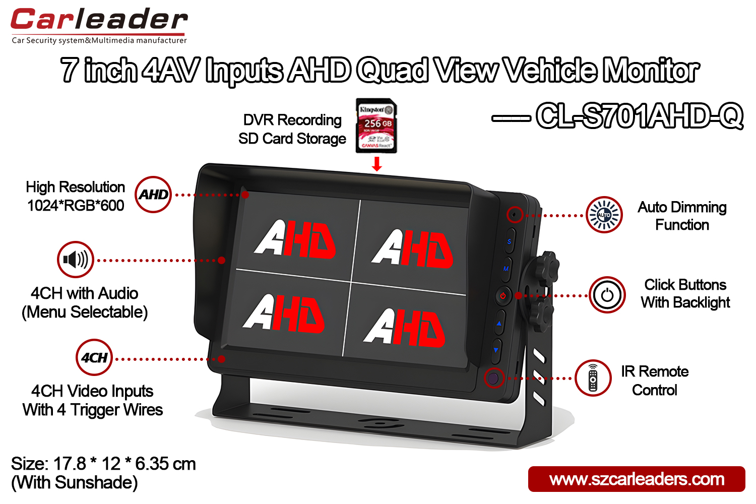 కార్లీడర్ మా గురించి మీకు అందించడం గర్వంగా ఉంది7 అంగుళాల 4CH AHD ఇన్పుట్లు క్వాడ్ వ్యూ డిస్ప్లే మానిటర్, క్వాడ్ వ్యూ డిజైన్ వాహన కెమెరా కోసం 4 ఛానెల్లకు సపోర్ట్ చేయగలదు, ఉదాహరణకు, ఫ్రంట్ వ్యూ, సైడ్ వ్యూ x2, రియర్ వ్యూ, పెద్ద వాహనాల డ్రైవర్లను (బస్సులు, ట్రక్కులు మరియు డెలివరీ వ్యాన్లు, వాహనాన్ని నడుపుతున్నప్పుడు వారి పరిసరాలలోని బహుళ వీక్షణలను పర్యవేక్షించడానికి అనుమతిస్తుంది.