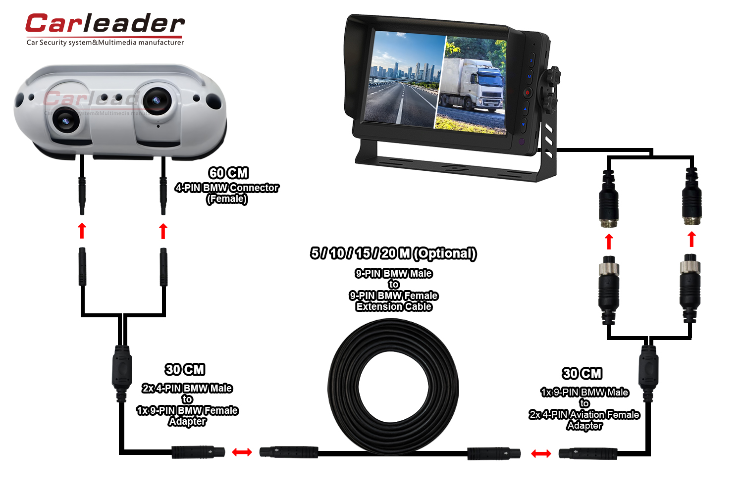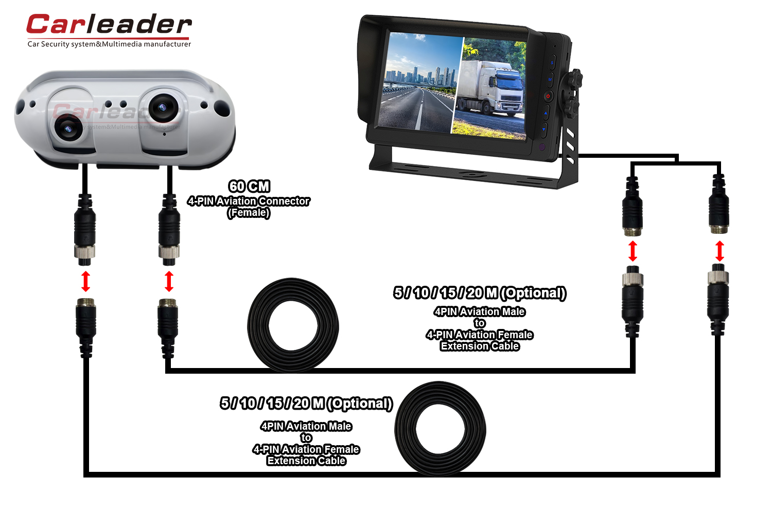 వివిధ వైరింగ్ అవసరాలకు సరిపోయేలా AHD స్టార్లైట్ డ్యూయల్ లెన్స్ హెవీ డ్యూటీ రియర్ వ్యూ కెమెరా కోసం కార్లీడర్ రెండు వేర్వేరు వైరింగ్ సొల్యూషన్ను అందిస్తుంది: