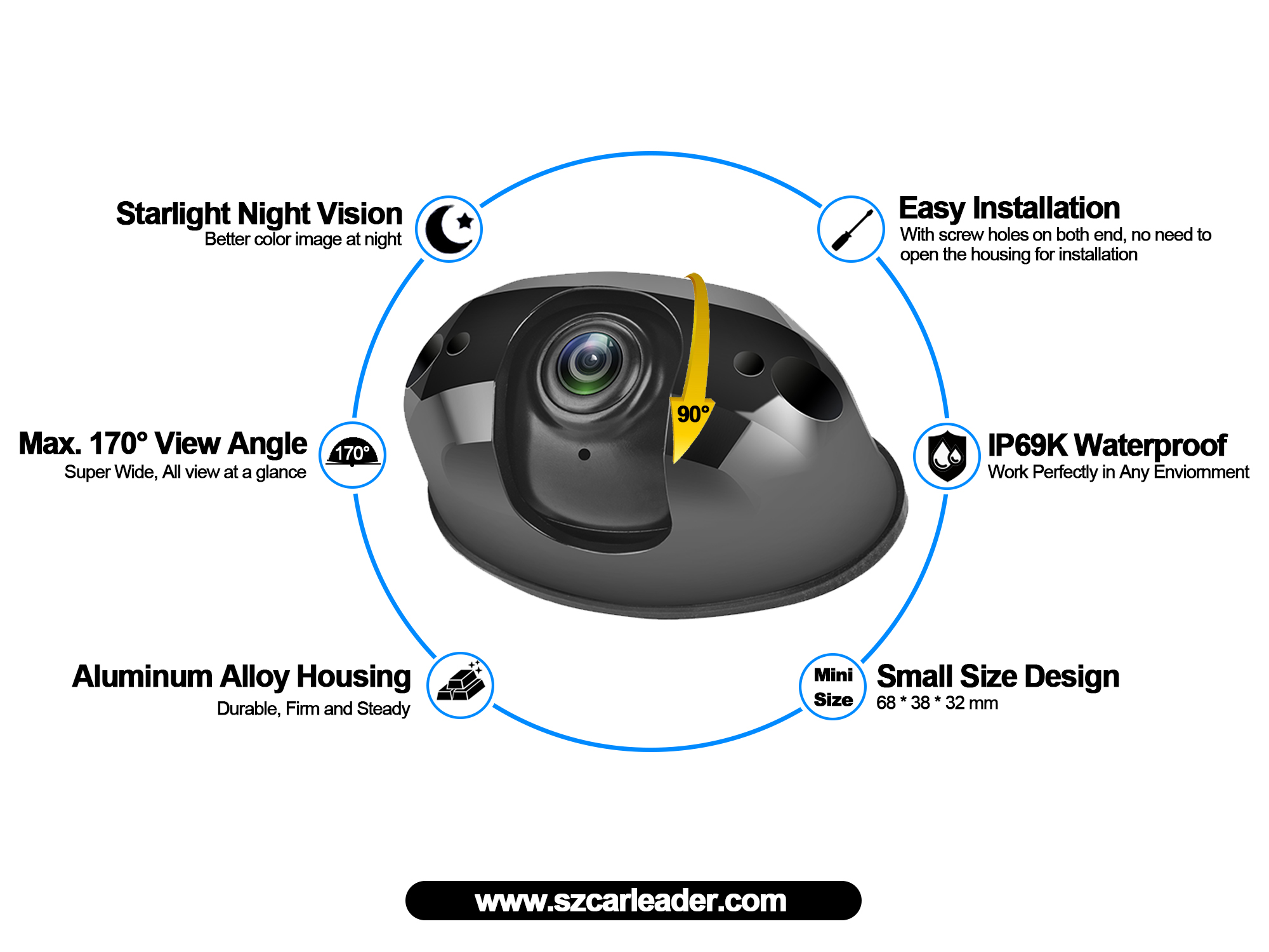 AHD 170 డిగ్రీ వైడ్ వ్యూ యాంగిల్ వాటర్ప్రూఫ్ హెవీ డ్యూటీ బ్యాకప్ కెమెరా డ్రైవింగ్ ప్రక్రియలో డ్రైవర్కు స్పష్టమైన నిజ-సమయ చిత్రాన్ని అందిస్తుంది. దీని అతి పెద్ద కోణం 170° వరకు ఉంటుంది, డ్రైవర్కు విస్తృత స్థాయి పర్యవేక్షణ పరిధిని అందించడం కోసం మరింత ఎక్కువ, తద్వారా డ్రైవర్ వాహనం చుట్టూ ఉన్న వాతావరణాన్ని ఎలాంటి బ్లైండ్ స్పాట్లు లేకుండా పర్యవేక్షించగలరు
