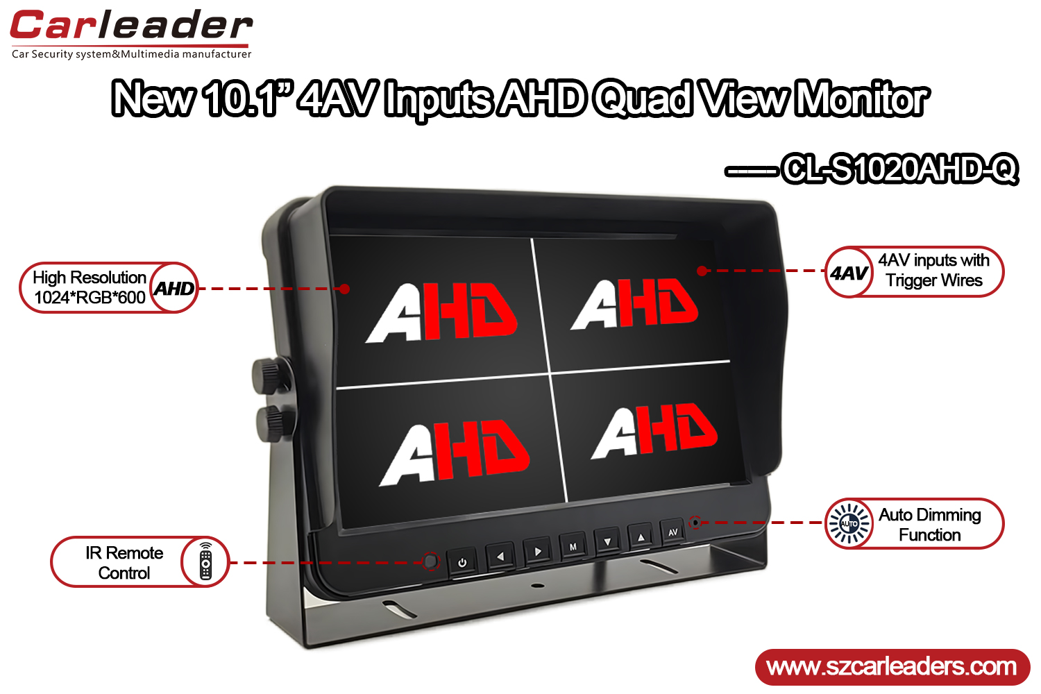 వాహనం, భద్రత మరియు పారిశ్రామిక పర్యవేక్షణ అనువర్తనాలకు అనువైనది,కార్లీడర్ 10.1 అంగుళాల 4CH క్వాడ్ డిస్ప్లే హెవీ డ్యూటీ వెహికల్ AHD మానిటర్కాంపాక్ట్ మరియు మన్నికైన ప్యాకేజీలో బలమైన కార్యాచరణ, స్పష్టమైన ప్రదర్శన నాణ్యత మరియు వినియోగదారు-కాన్ఫిగర్ చేయదగిన ఎంపికలను మిళితం చేస్తుంది.