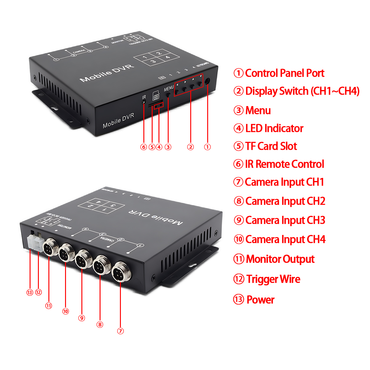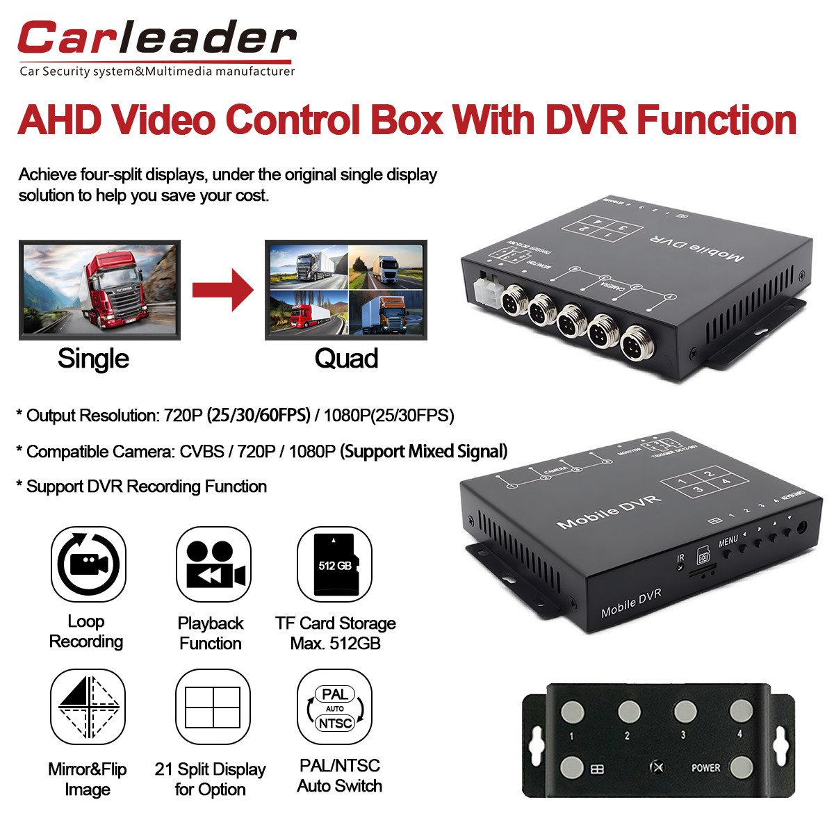 కార్లీడర్ క్వాడ్ వీడియో స్ప్లిటర్ బాక్స్ DVR రికార్డింగ్ ఫంక్షన్ యొక్క భద్రతతో 4CH వీడియో స్ప్లిటర్ బాక్స్ సౌలభ్యాన్ని మిళితం చేస్తుంది. ప్రత్యేక ఇమేజ్ సెట్టింగ్, ఫ్లెక్సిబుల్ ట్రిగ్గర్ మోడ్లు (ట్రిగ్గర్ వైర్ & రిమోట్ కంట్రోల్), స్క్రీన్ ఎడ్జ్ అడ్జస్ట్మెంట్, వైడ్ వోల్టేజ్ ఇన్పుట్ మరియు పటిష్టమైన రక్షణతో సహా దాని సమగ్ర ఫీచర్ సెట్ - డిమాండ్ ఉన్న మొబైల్ వాతావరణానికి అనుగుణంగా నమ్మదగిన మరియు అధిక-నాణ్యత నిఘా పరిష్కారాన్ని అందిస్తుంది. కార్లీడర్ 1080P AHD క్వాడ్ స్ప్లిట్ డిస్ప్లే వీడియో ప్రాసెసర్ సపోర్ట్ వీడియో రికార్డింగ్తో పూర్తి సందర్భోచిత అవగాహన మరియు సురక్షిత వీడియో సాక్ష్యం ఉండేలా చూసుకోండి.